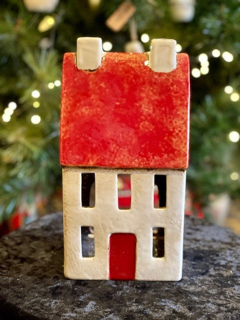 GORGEOUS STONEWARE HOUSES PERFECT AS A VILLAGE. HAND PAINTED AND STONE WARE PERFECT TO ILLUMINATE WITH TEA LIGHT CANDLE OR LED LIGHTS. MEASURES 26CM H X 13CM W