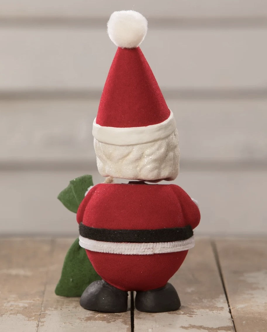 Capture the essence of a Retro Christmas with this delightful, winking Santa that opens up to hold a special gift or candy! Features red flocking, chenille trim, and green fabric bag.
