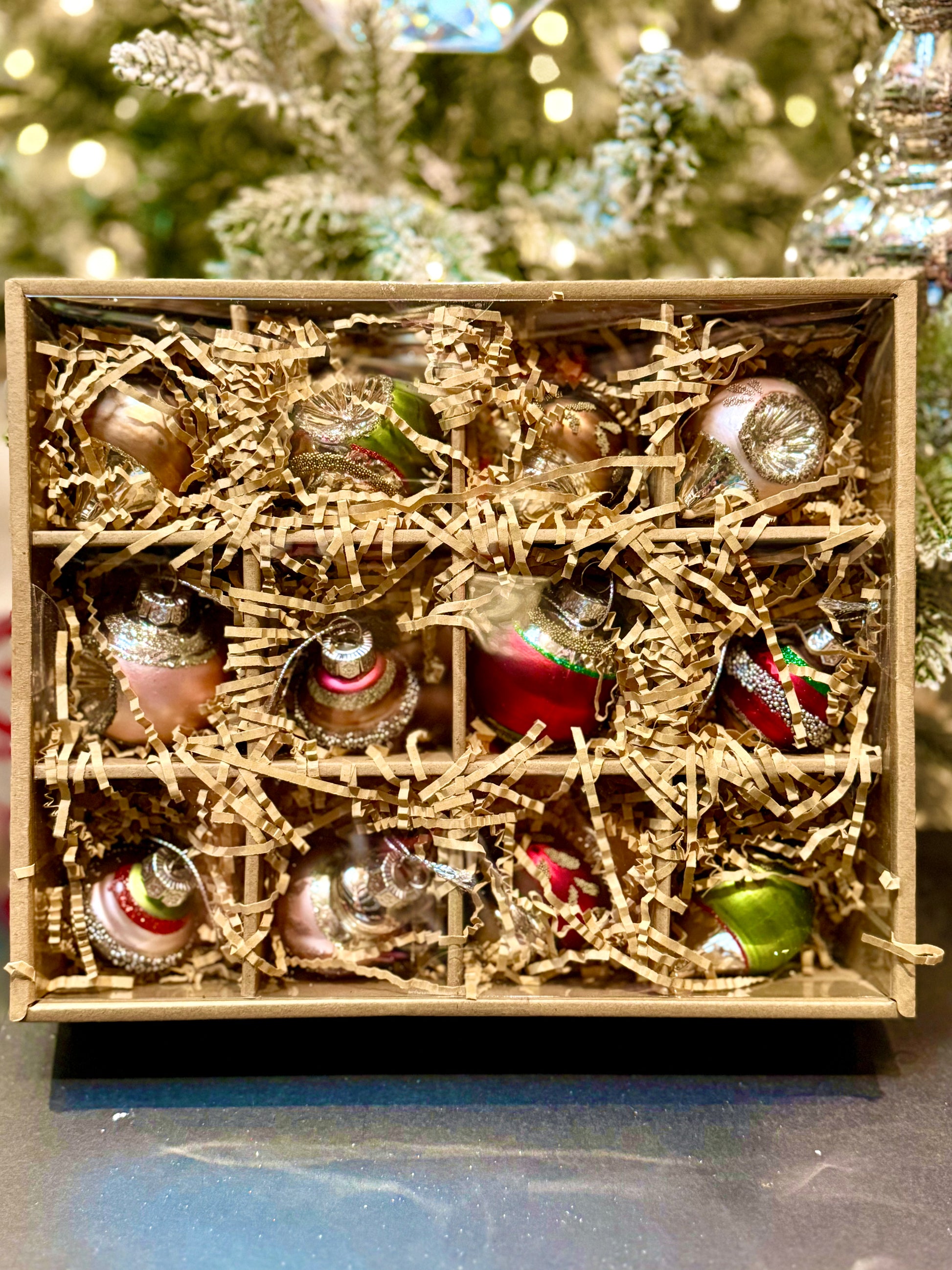 BOX OF 12 VINTAGE 2 INCH GLASS ORNAMENTS 4520925