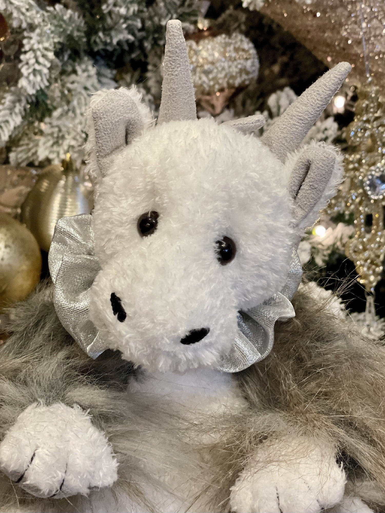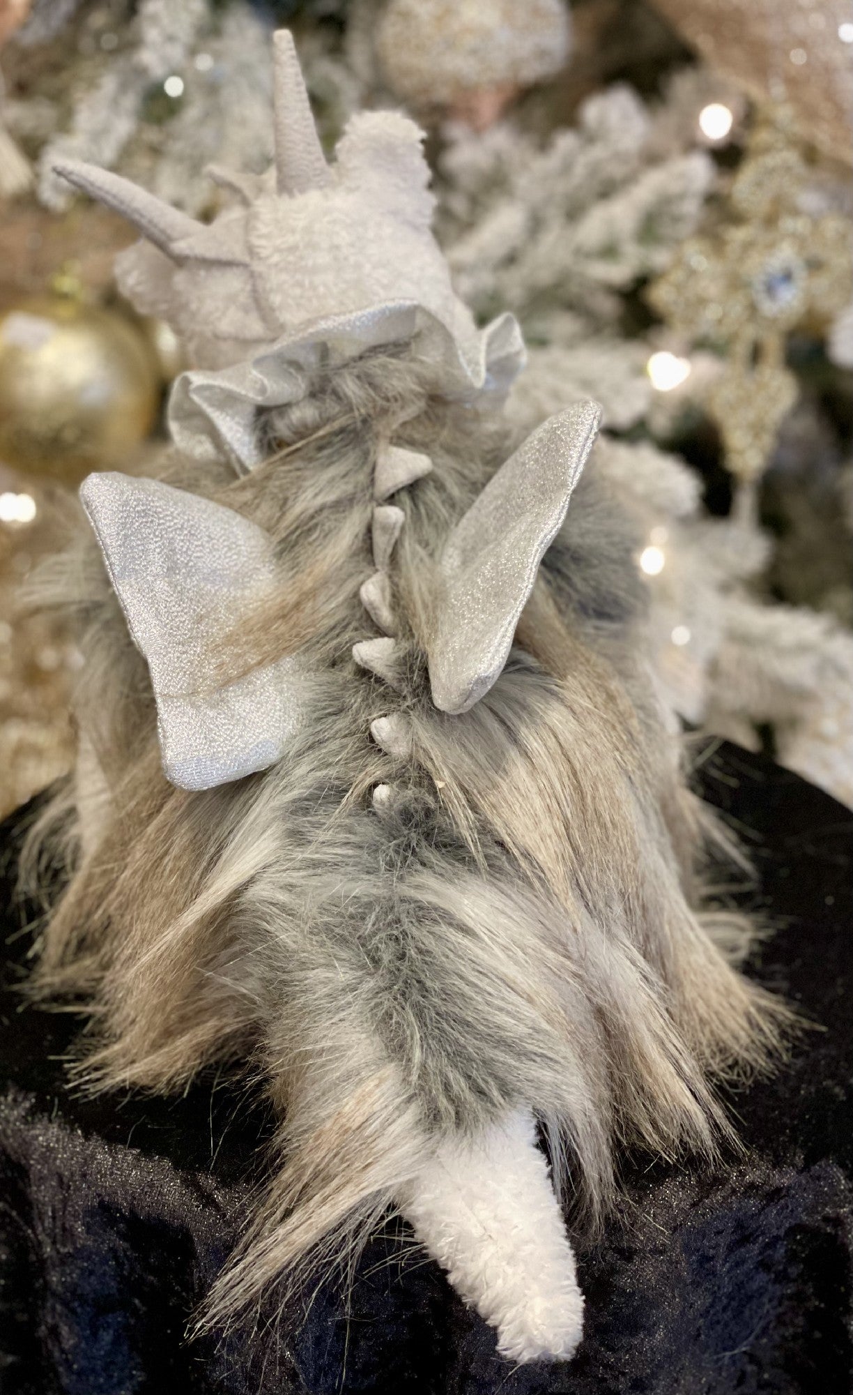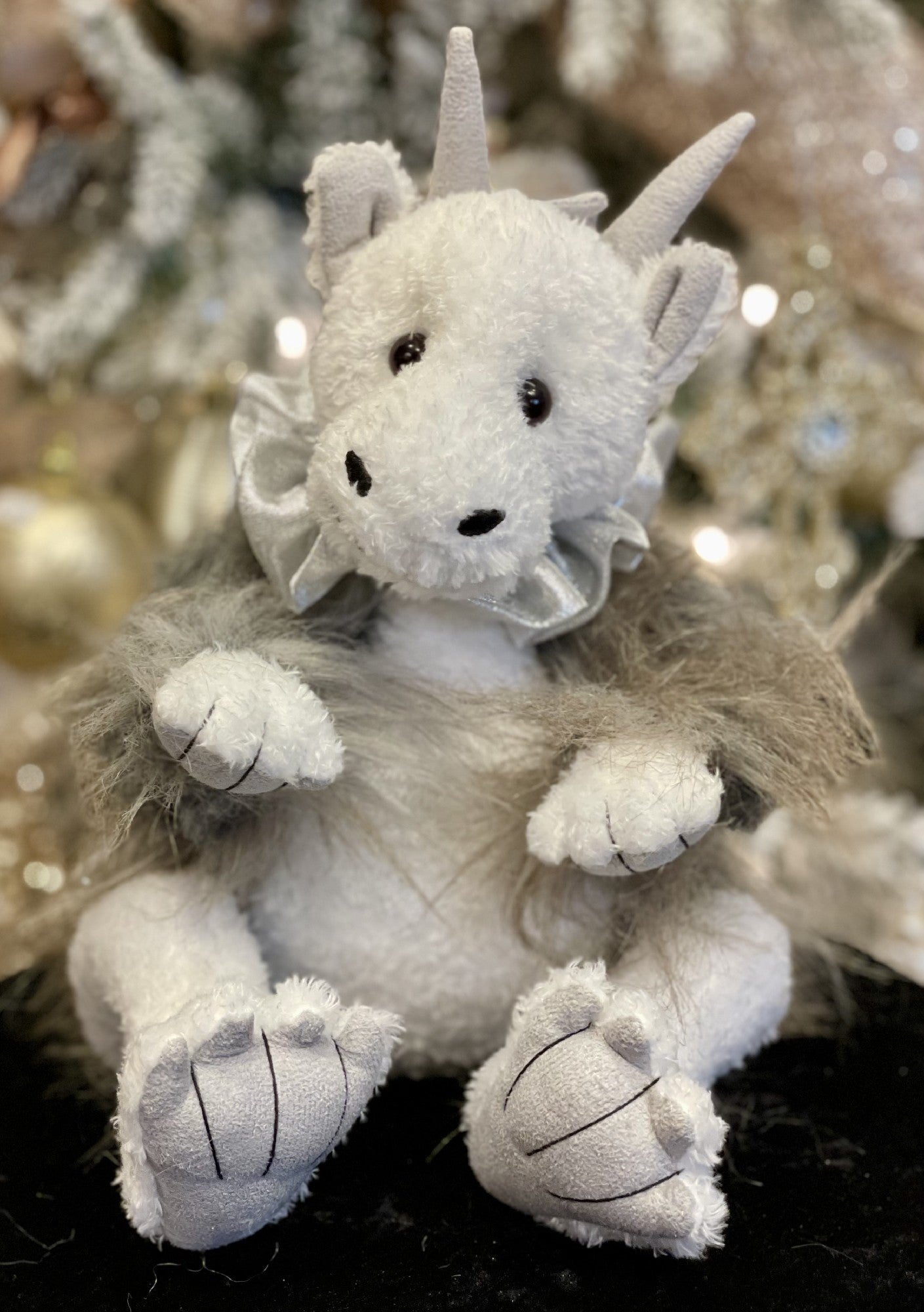 Storm Chaser is one of the two Dragons from the Charlie Bear 2023 Plush Collection, and they are both baby dragons. He has tight curly fur in white, that is repeated on his tummy and legs. The rest of his body is covered in long strandy fur in brown and grey tones. His cute face has dark eyes, and small horns. His paw pads are light grey, and stitched.