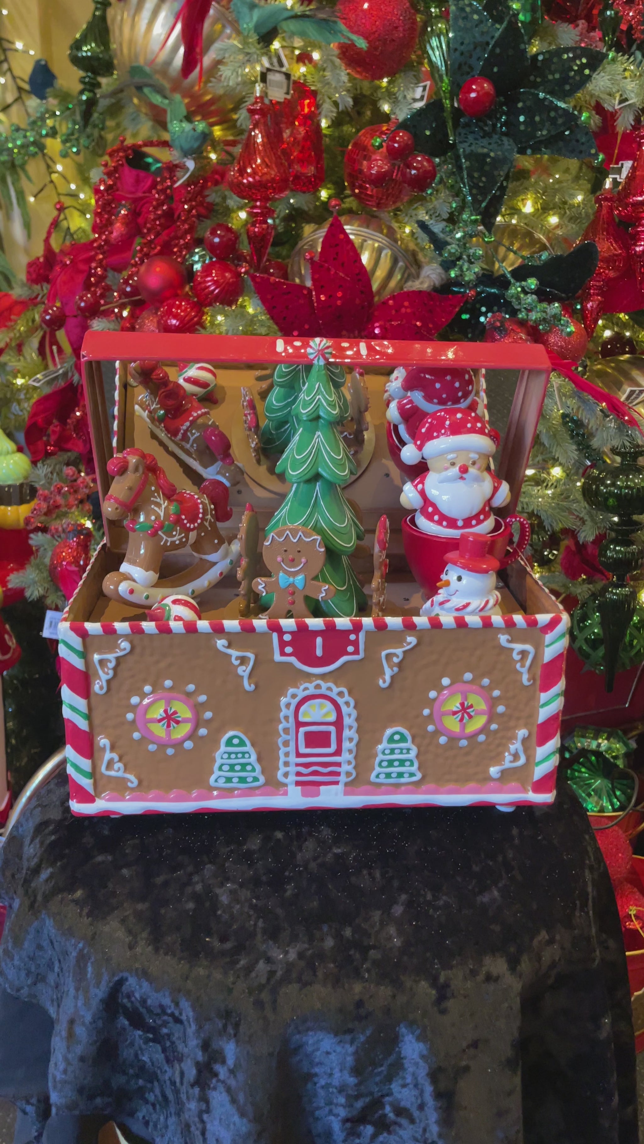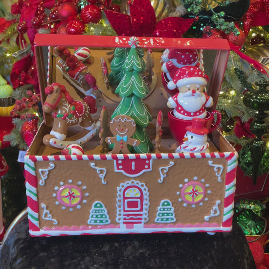Delightful Tin Treasure Box handpainted with Rocking Horse, Turning Gingerbread Kids and Popping up and down Santa. Plays 8 songs, runs on power with or without music playing.