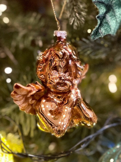 AGED GOLD GLASS CHERUB WITH WINGS HANGING ORNAMENT 8CM X 4.5CM