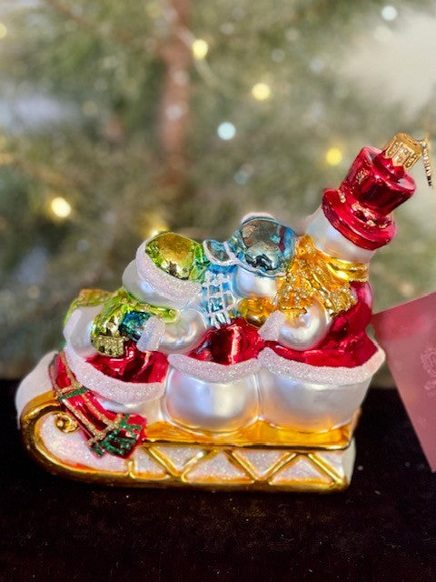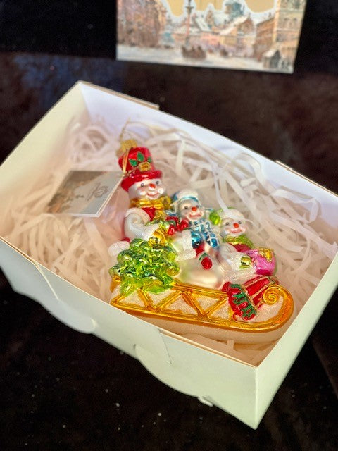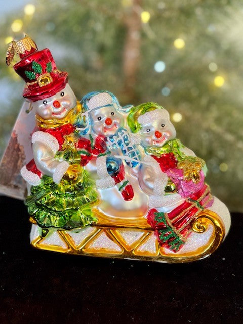 HURAS FAMILY GLASS ORNAMENTS - THREE SNOWMEN IN SLEIGH S420