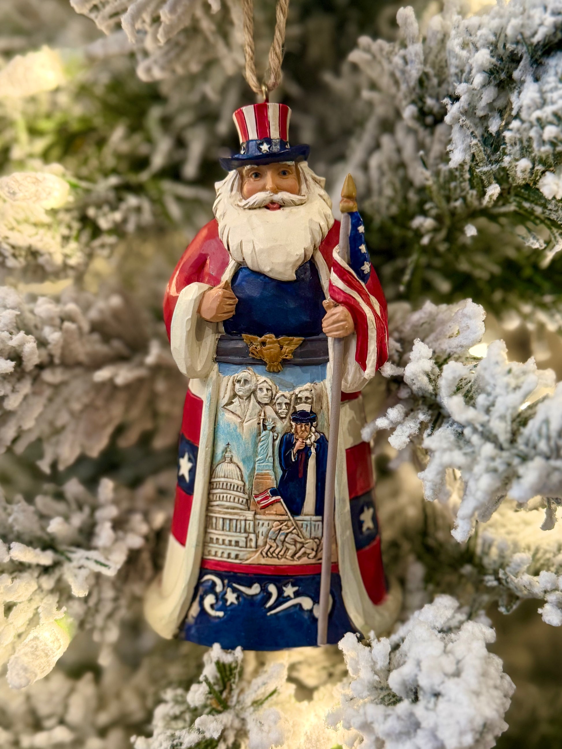 Jim Shore’s Santas Around the World collection shines a light on holiday traditions of cultures near and far. A heartfelt tribute to the spirit of America, Star Spangled Santa features iconic USA symbols, including Mt. Rushmore, Uncle Sam, and more. Captures American Santa, accurately hand-painted and crafted in high-quality stone resin. Ornament hangs by jute rope and features a handcrafted look.