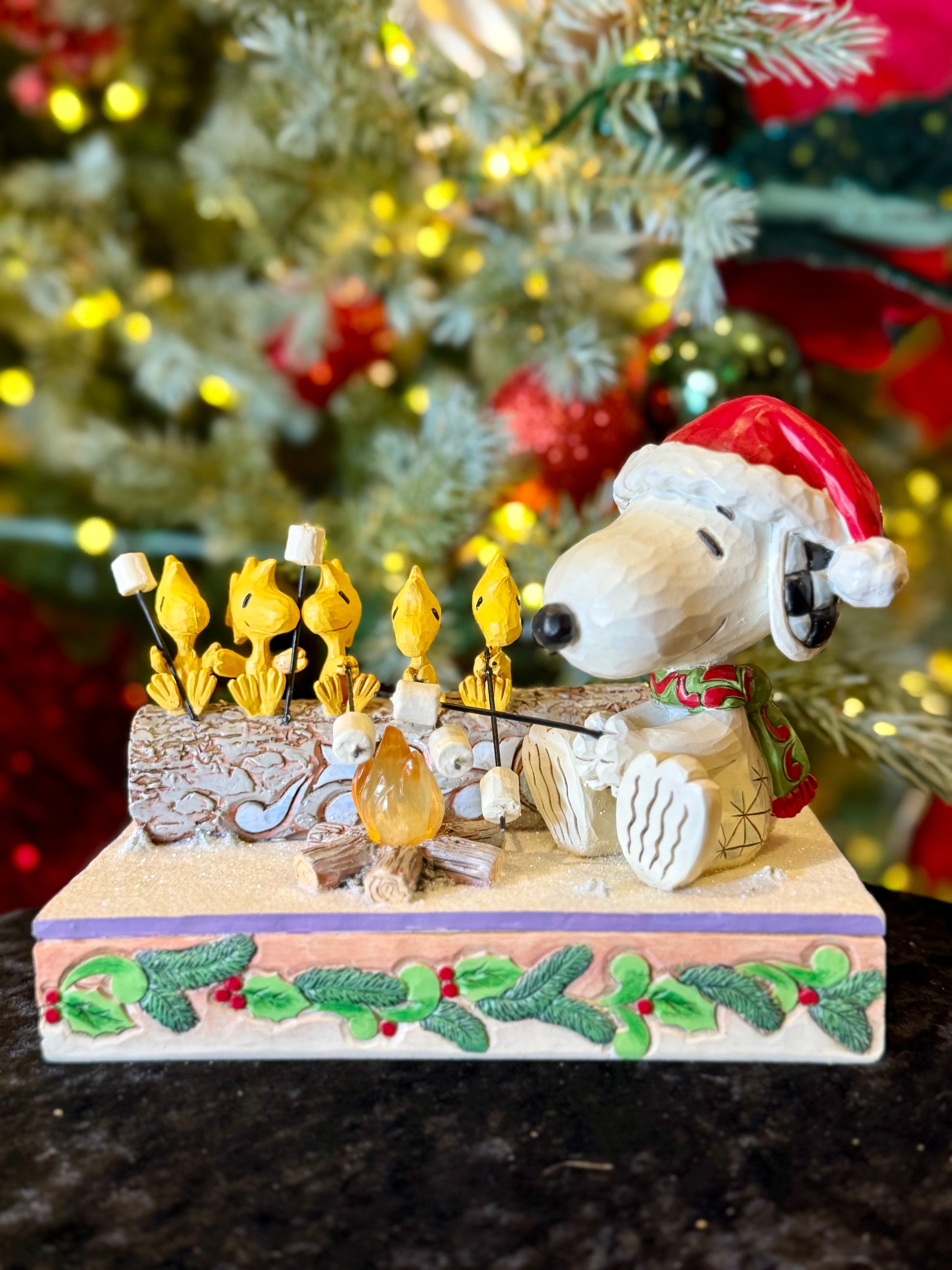 Warm up your holiday decor with this charming Jim Shore design of Snoopy and Woodstocks roasting marshmallows over a cozy LED flickering fire. Snoopy wears a Santa has as he shares a joyful smile and sweet treats with his feathered friends.