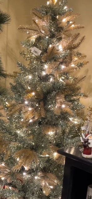 Light up your festivities with a gentle golden glow this season. Pine branches sprayed with a mist of golden magic results in this very elegant tree, complete with matching gold dusted pot. Features 526 tips, 150 LED.