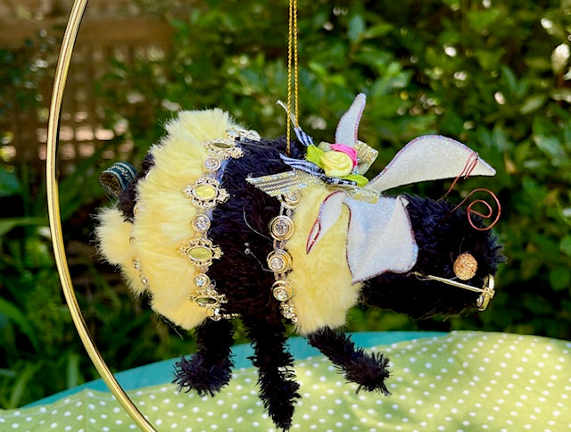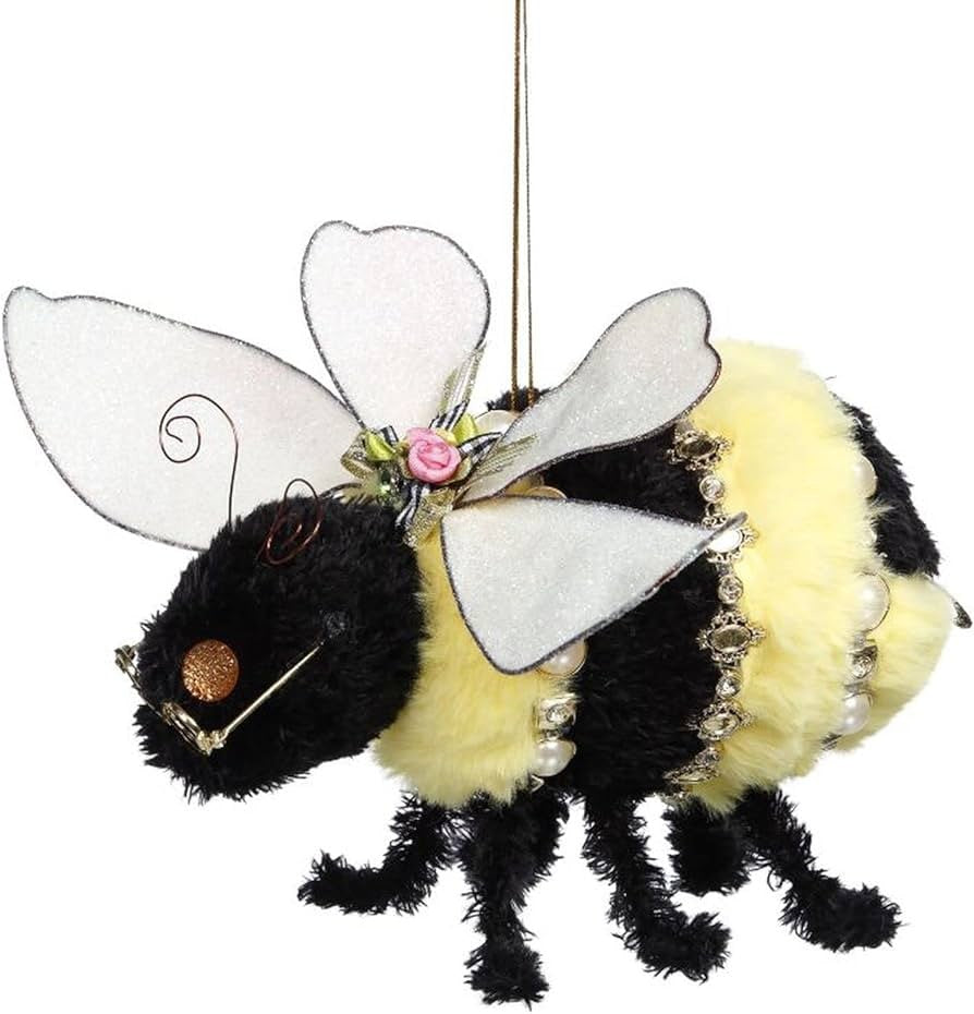 Mark Roberts Large Bumble Bee measures 6 inches. The design features a furry black and yellow bee embellished with beads, florets, and ribbons. A charming colorful display piece hung on your mantel, across the window, or from the ceiling.