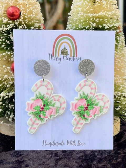 PINK & WHITE CANDY CANE WITH HOLLY SPRIG EARRINGS