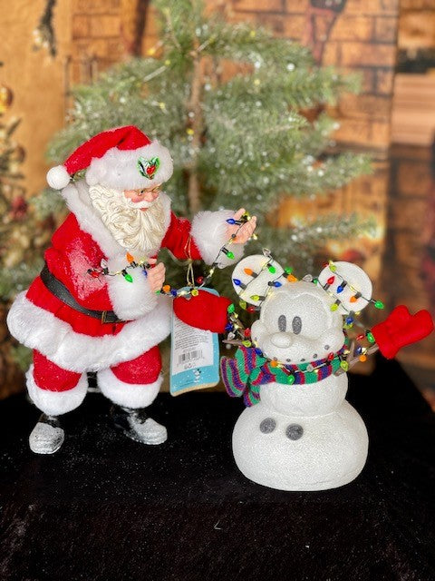 Your eyes will light up when you see this 2 piece Disney licensed Possible Dreams collectible. Snow Mickey lights up to add even more spirit to the season and the design. Designed by Ann Dezendorf, this Clothtique Santa is adding the lights to this Disney Snow Mickey. The 2 piece set includes fur, a knit scarf and the signature brass tag. Possible Dreams Clothique figurines have been hand-made since 1985 and are designed in the United States. Each collectible is unique and made to reflect cherished family memories and to bring holiday traditions to life.