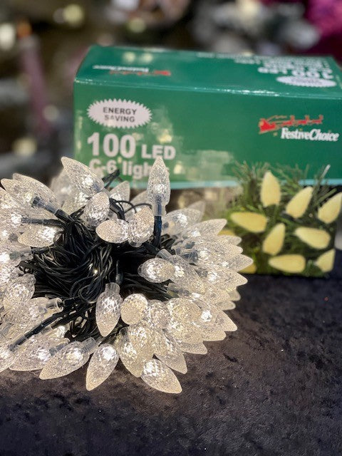 SET OF 100 LED WARM WHITE DIAMOND PATTERN C-6 LIGHTS FOR INDOOR OR OUTDOOR USE. CORD COLOUR IS GREEN. MULTIFUNCTION BUTTON ON TRANSFORMER WITH 8 FUNCTIONS.7.92 METRES OF LIGHTS WITH 5 METRES TO PLUG.